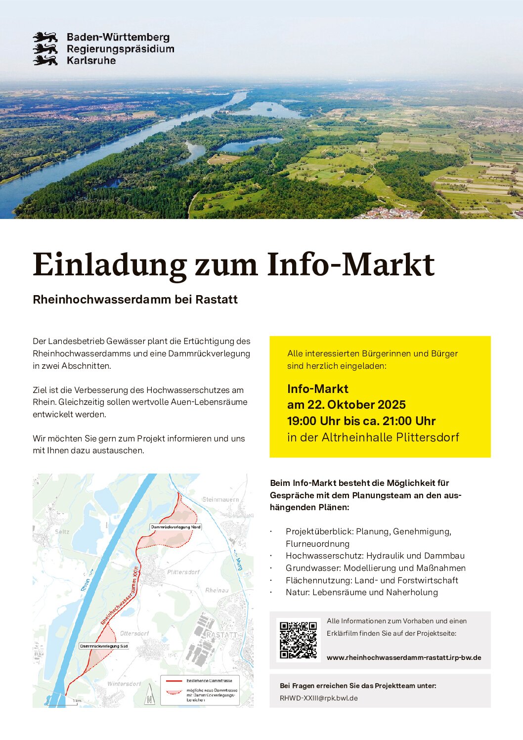 Der Landesbetrieb Gewässer des Landes Baden-Württemberg lädt zum Info-Markt zur geplanten Ertüchtigung und Dammrückverlegung des sanierungsbedürftigen Rheinhochwasserdamms ein.