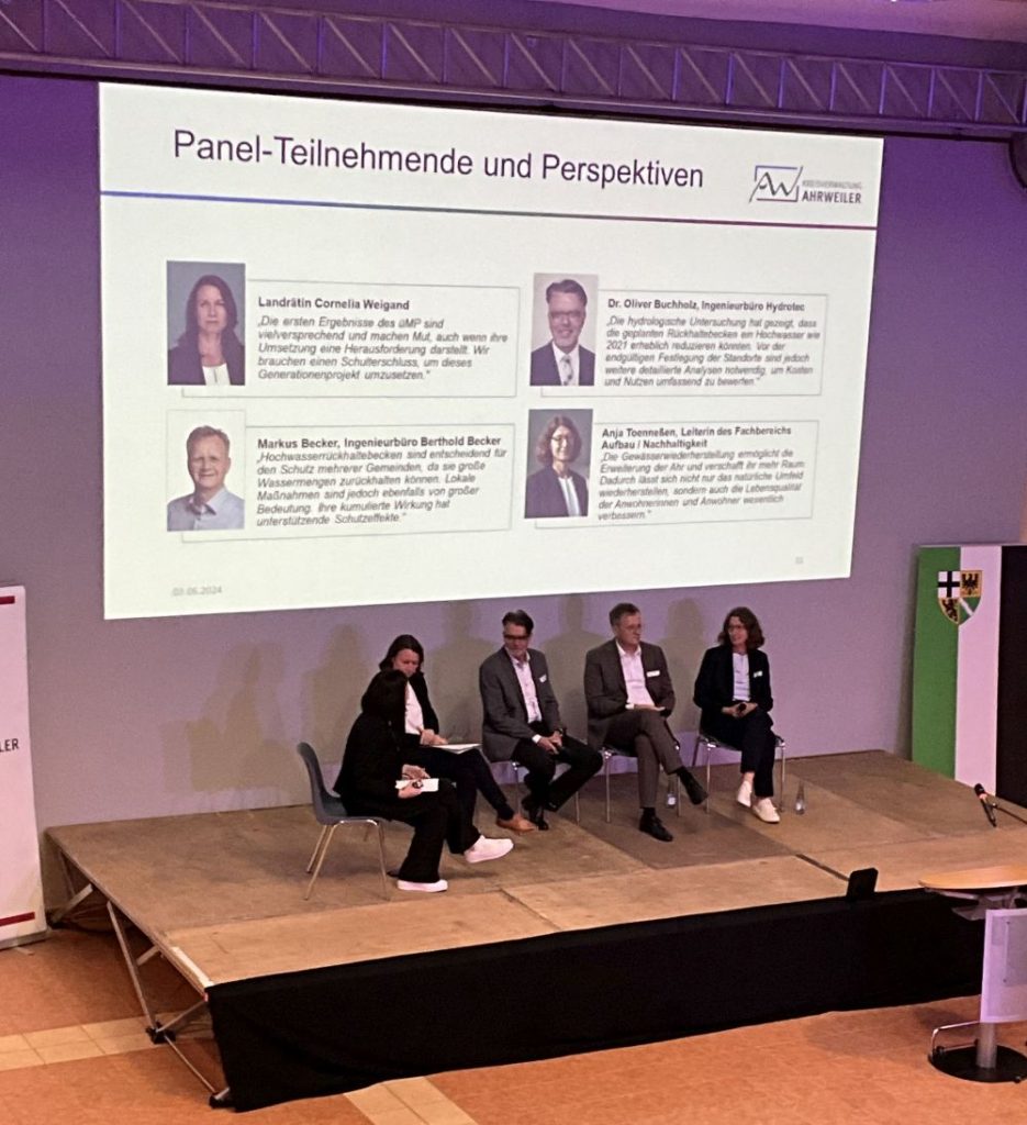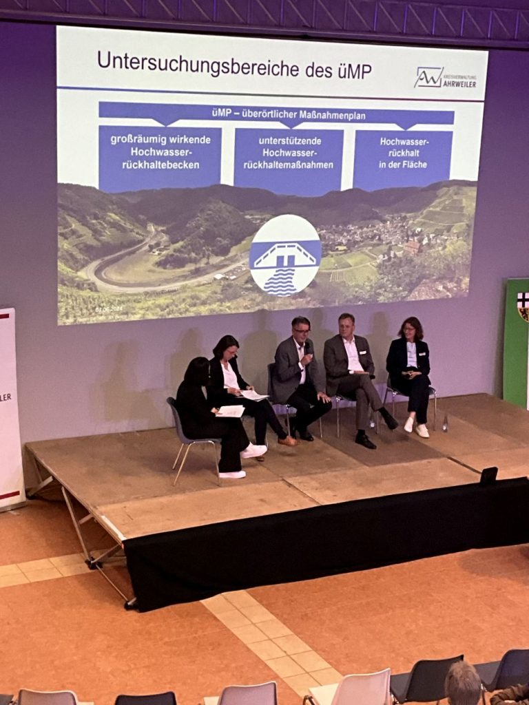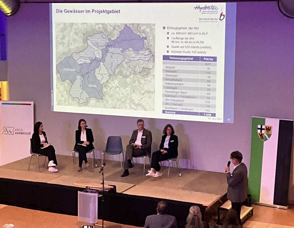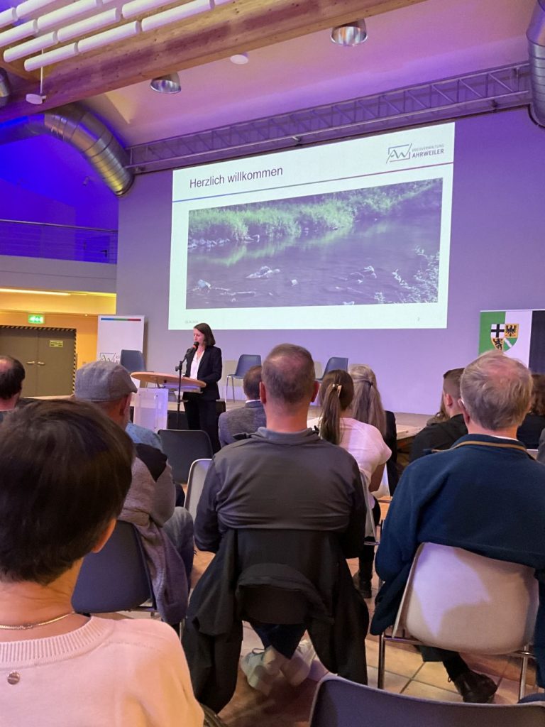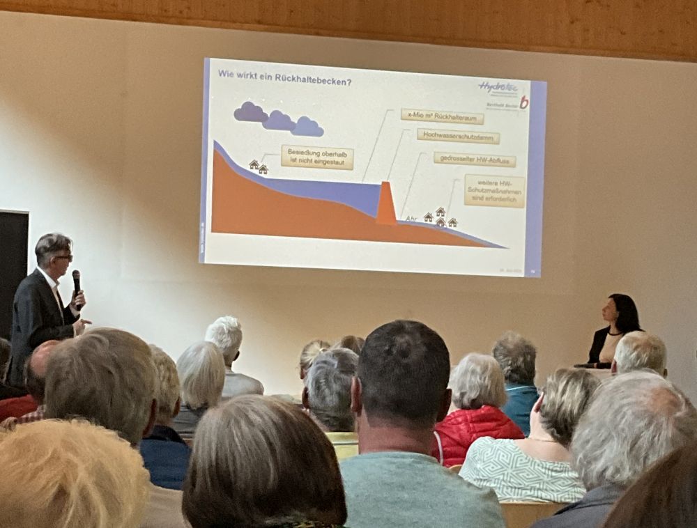Darin erläuterten die Projektverantwortlichen der Kreisverwaltung Ahrweiler zusammen mit Landrätin Cornelia Weigand und den Ingenieurbüros Hydrotec und Berthold Becker, welche Erkenntnisse in den letzten Monaten in Bezug auf den „Plan zur Umsetzung und Weiterentwicklung von überörtlichen Maßnahmen zur Hochwasser- und Starkregenvorsorge“ – kurz überörtlicher Maßnahmenplan – gewonnen wurden.