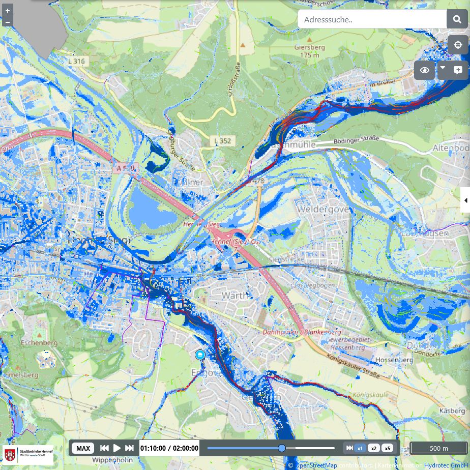 Die Stadt Hennef veröffentlicht animierte Starkregengefahrenkarten, die von Hydrotec erarbeitet wurden. Sie sind auf der Internetseite der Kommune „Starkregen und Hochwasser“ verlinkt und stehen – zusammen mit wertvollen Informationen zur Vorsorge für die Folgen von Starkregen und Hochwasser – nun öffentlich zur Verfügung. Die interaktive Karte auf Basis von HydroAS MapView bietet für alle die Möglichkeit, Kommentare mit Hinweisen zum Thema zu ergänzen.