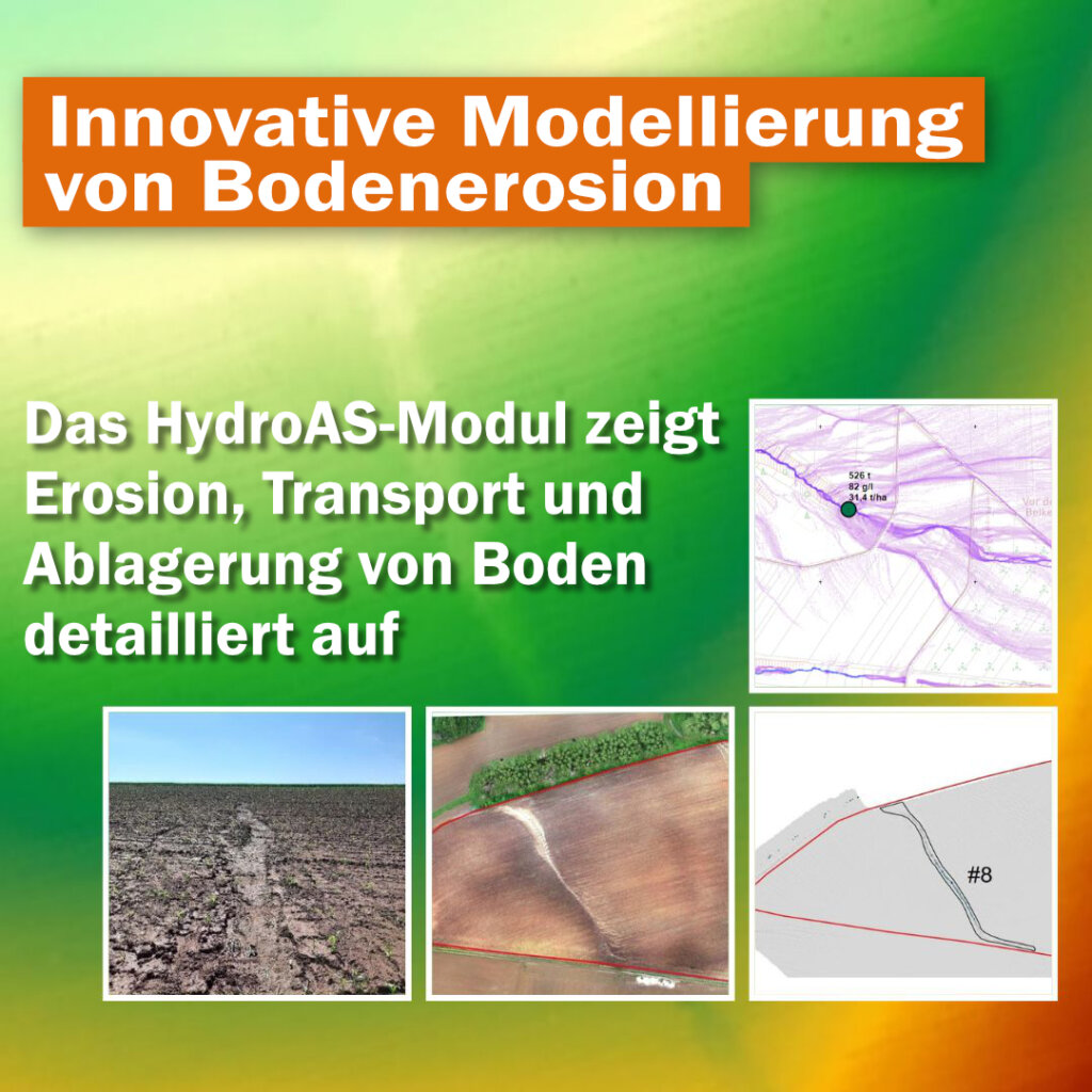 Durch Starkregenereignisse entstehen Sturzfluten, die Mensch, Infrastruktur und Umwelt schaden können. Zusätzlich führen die hohen, kinetischen Kräfte der intensitätsstarken Niederschläge häufig zum Bodenabtrag von landwirtschaftlichen Flächen. Die Folgen der Bodenerosion sind Schäden auf urbanen Flächen, Abtrag und Verlust des Oberbodens auf landwirtschaftlichen Flächen sowie der Eintrag von Nähr- und Schadstoffen in Oberflächengewässer. Zur Abschätzung möglicher Gefahren und zur Konzeption von Maßnahmen gegen Bodenerosion wurde ein Modul zur Simulation von Bodenerosion in HydroAS implementiert.