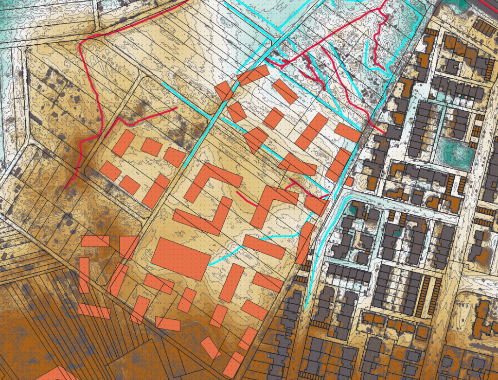 Eine GIS-Analyse untersucht, wie sich die geplanten Gebäude und die möglichen Standorte für Maßnahmen zur vorhandenen Topografie und zu den oberflächlichen Fließwegen und Grabenstrukturen verhalten. Ziel ist es zu ermitteln, wie anfallendes Regenwasser zu möglichen Maßnahmenstandorten geleitet werden kann und wie ggf. vorhandene Strukturen