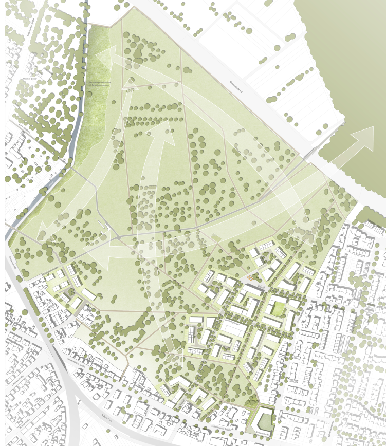 Versickerungspotenzial bieten freizuhaltende unversiegelte Flächen, anzulegende Versickerungsmulden und Baumrigolen. Dachbegrünung, multifunktionale Retentionsräume und teichähnliche Anlagen tragen zu einer erhöhten Verdunstung bei. Muldenstrukturen, die bei einem bestimmten Wasserstand aktiviert werden, können oberflächlich abfließendes Wasser verzögern. Nachrangig sind Grauwassernutzung, Rückhaltung in Zisternen und Ableitung über Trennkanalisation angedacht.