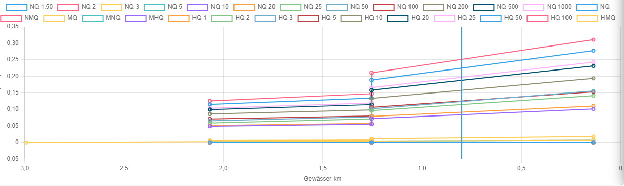 Der Längsschnitt bietet detaillierte Informationen zu genau einem ausgewählten Gewässer und zeigt verschiedene Abflusssituationen an (z. B. HQ100, HQ Extrem …). Diese Abflusssituationen lassen sich flexibel zu- oder abschalten.