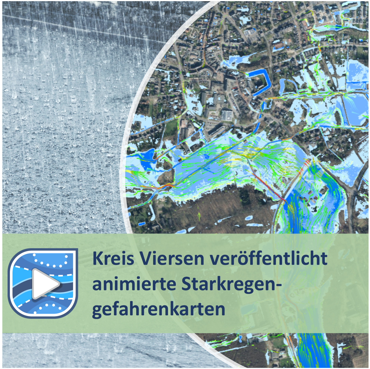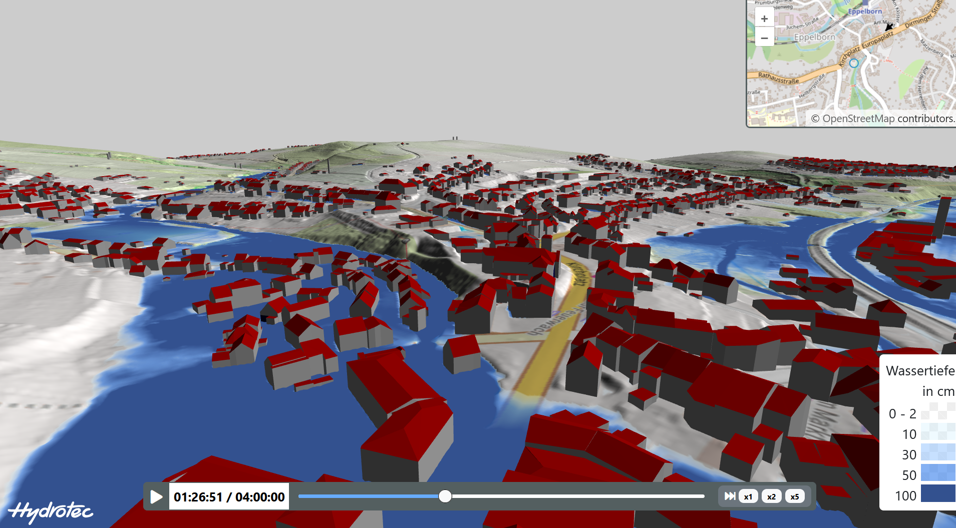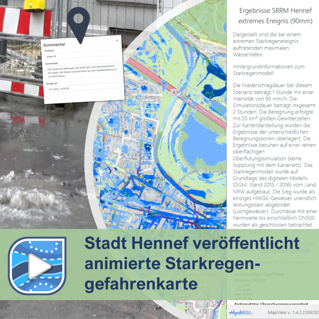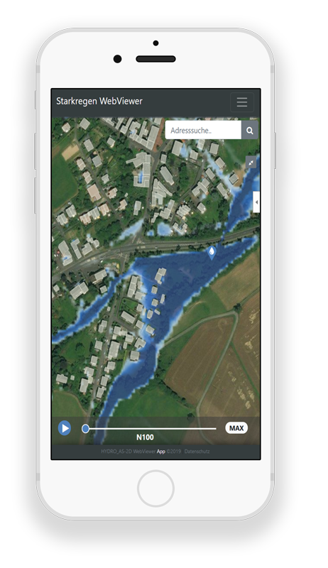 Der Starkregen WebViewer ist eine Web-Anwendung, die den Verlauf einer Überflutung nach einem Starkregenereignis auf dem Gebiet einer Kommune in einer Animation darstellt. Sie basiert auf Modellrechnungen mit HydroAS oder einem anderen 2D-Modell und wird mit dem Zusatzmodul MapView erzeugt.