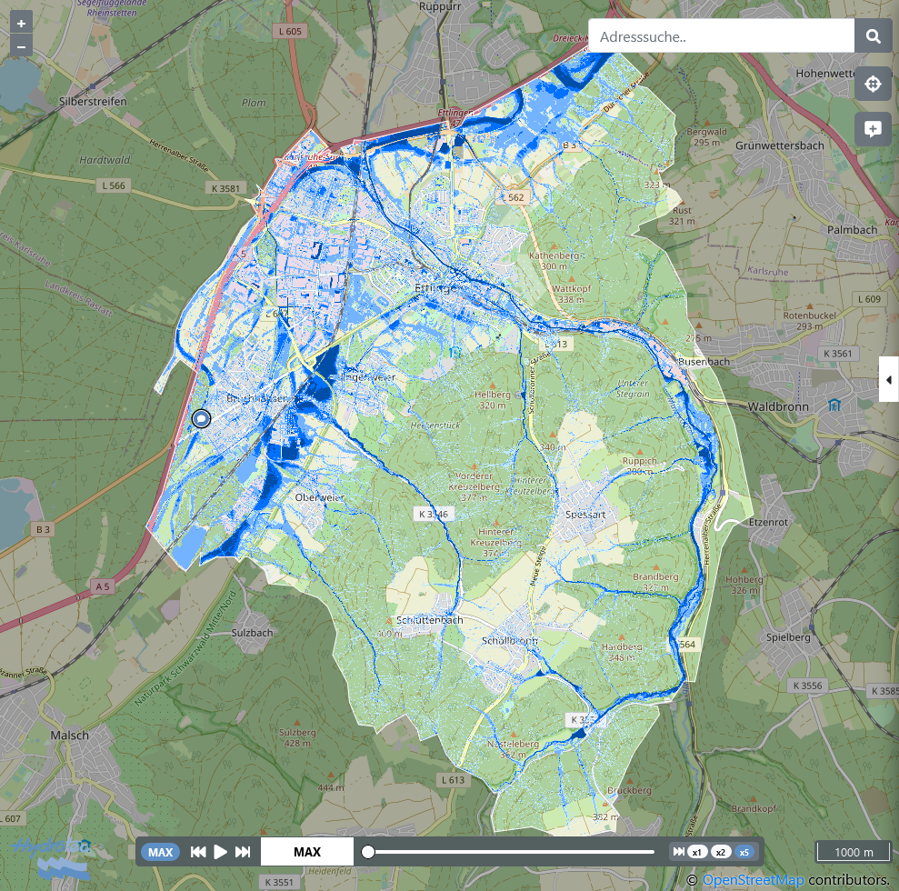Der Starkregen WebViewer ist eine Web-Anwendung, die den Verlauf einer Überflutung nach einem Starkregenereignis auf dem Gebiet einer Kommune in einer Animation darstellt. Sie basiert auf Modellrechnungen mit HydroAS oder einem anderen 2D-Modell und wird mit dem Zusatzmodul MapView erzeugt.