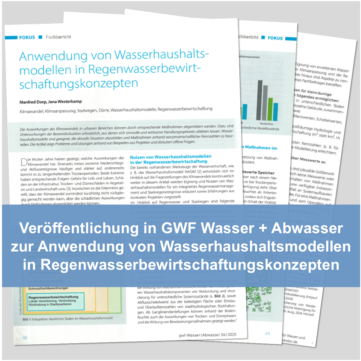 Dorp, M.; Westerkamp, J.: Anwendung von Wasserhaushaltsmodellen in Regenwasserbewirtschaftungskonzepten. In: GWF Wasser + Abwasser, (2025), Heft 6, S. 42-44